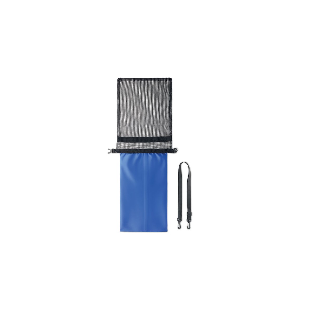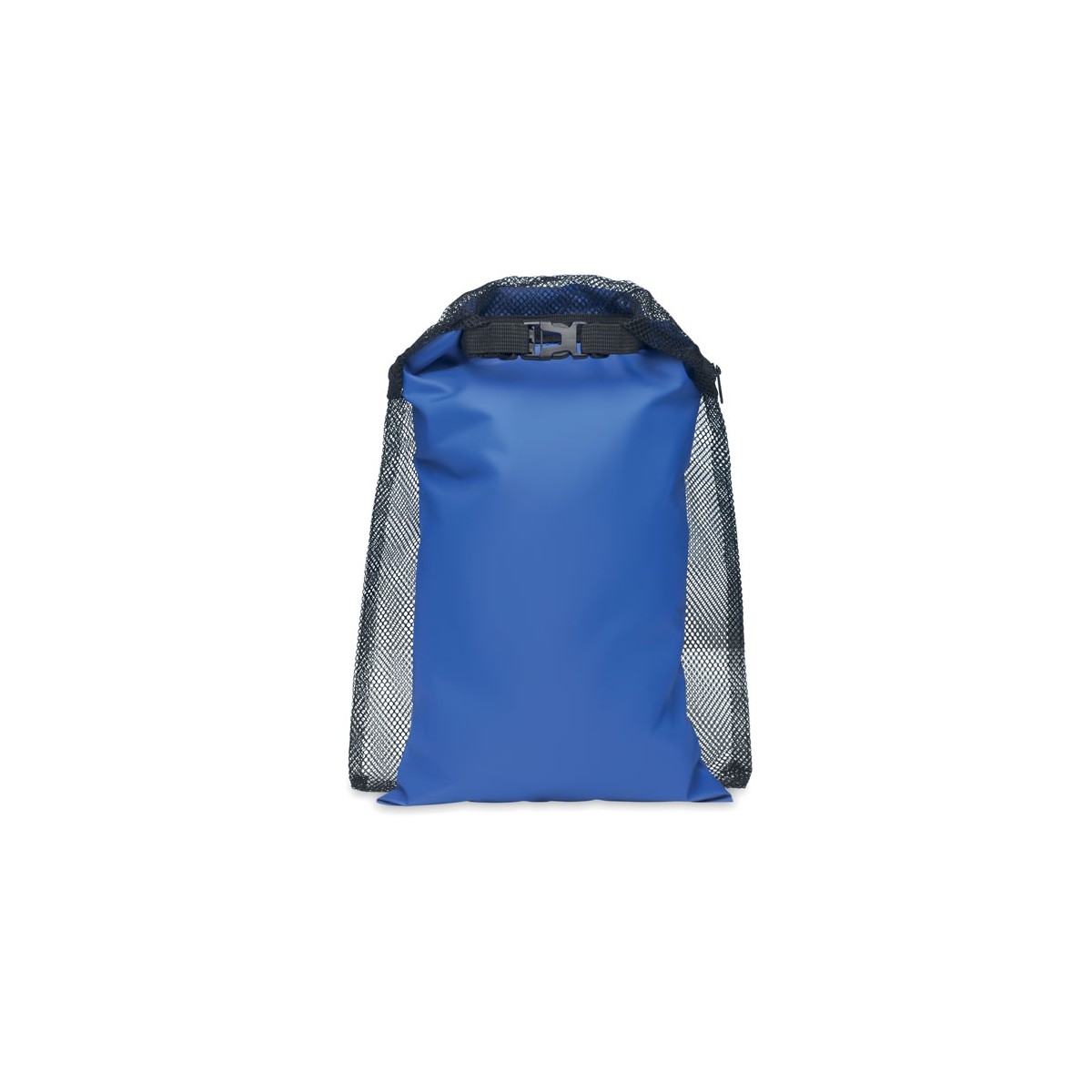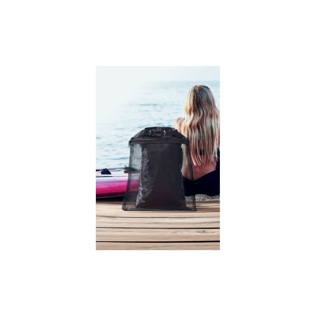 Borsa impermeabile 210 RPET all'interno di una borsa a rete RPET con cerniera. Mantenete le vostre cose asciutte quando siete vicino all'acqua. Riponete il telefono, portafoglio, soldi e altri oggetti in questa borsa impermeabile durante le attività acquatiche per assicurarvi che rimangano al sicuro e asciutti. Ideale per la barca o la spiaggia. Con una capacità di 6L hai un sacco di spazio per riporre le vostre cose. Sia la borsa che il sacchetto a rete sono fatti di plastica PET riciclata