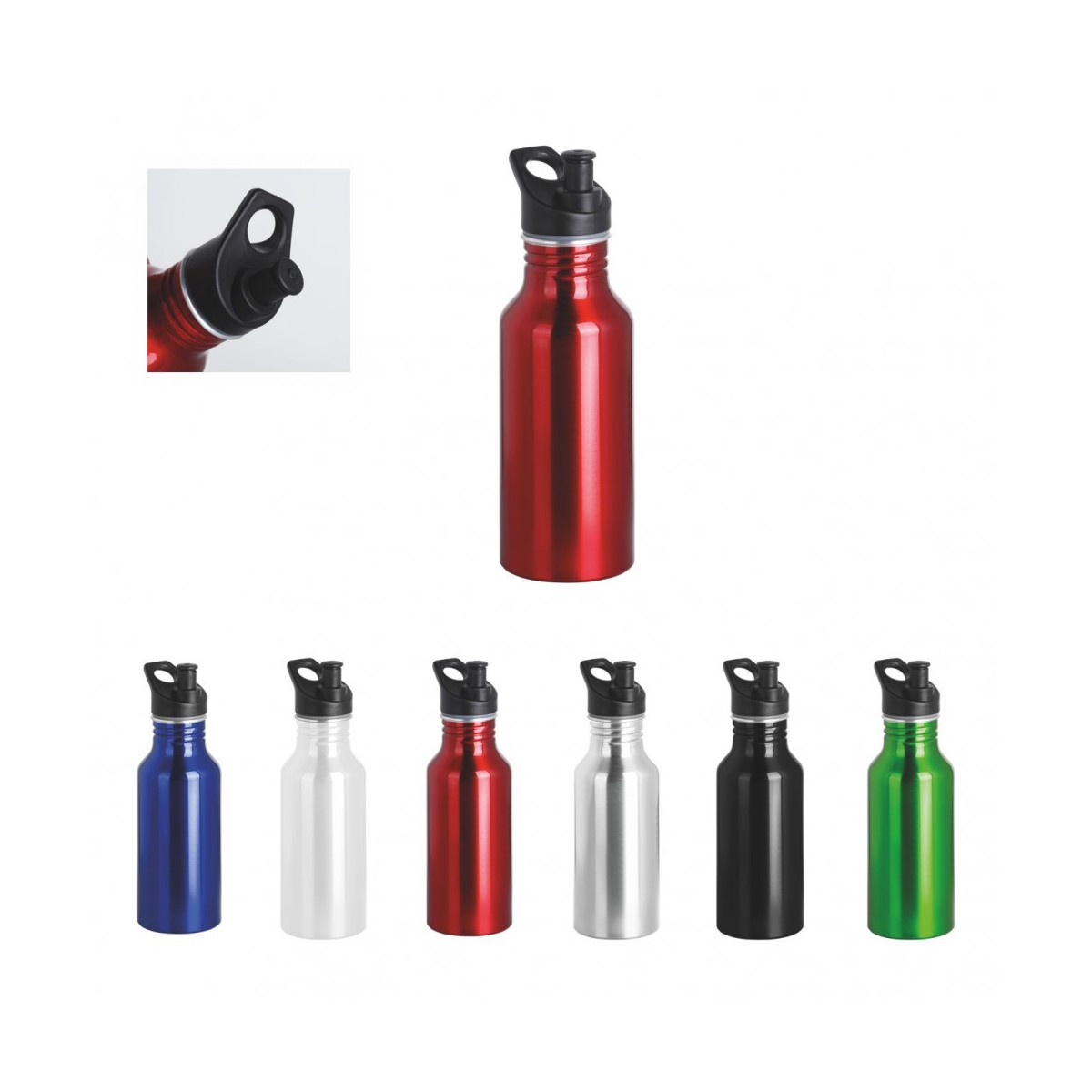 Borraccia 600ml, in alluminio lucido con beccuccio sportivo in ABS. Dimensioni: cm. ø 7 H 24. Confezione in Astuccio. Imballo: 50pz.