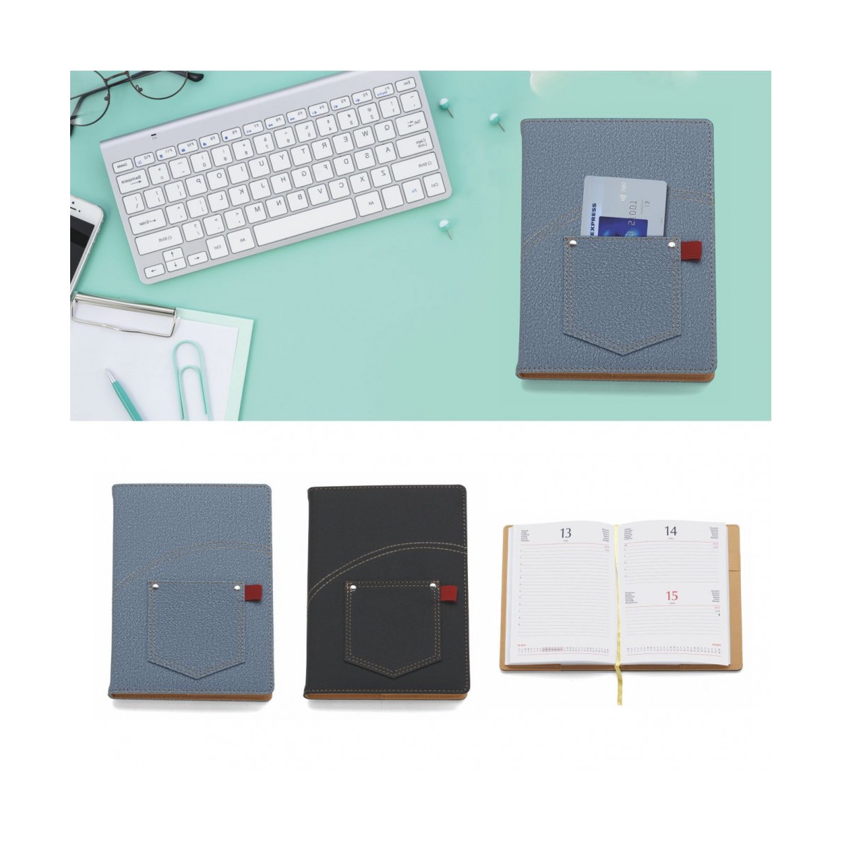 Agenda Giornaliera in similpelle con inserto per penna e tasca esterna. Interno estraibile. Dimensioni: cm 15x21, sabato e domenica abbinati, 320 pag. carta usomano bianca 60gr. Confezione in Astuccio. Imballo: 30pz.