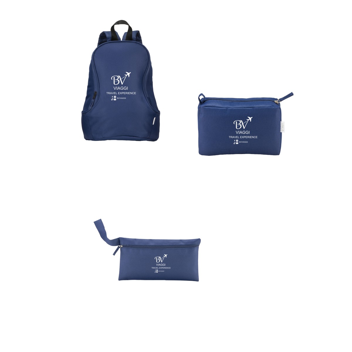 Il set è composto da 40 zaini cm 40x30x12 + 40 portadocumenti da viaggio con zip cm 29,5x16 + 40 beauty cm 21,5x13,5x8
