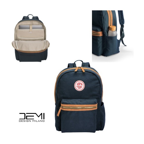 Zaino in canvas riciclato con compartimento imbottittito per notebook. Schienale e spallacci imbottiti, tasca frontale con cerniera e tasca laterale portabottiglia.