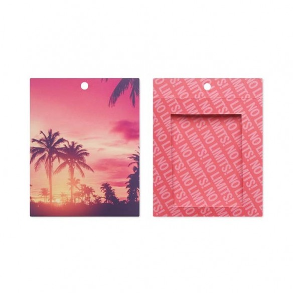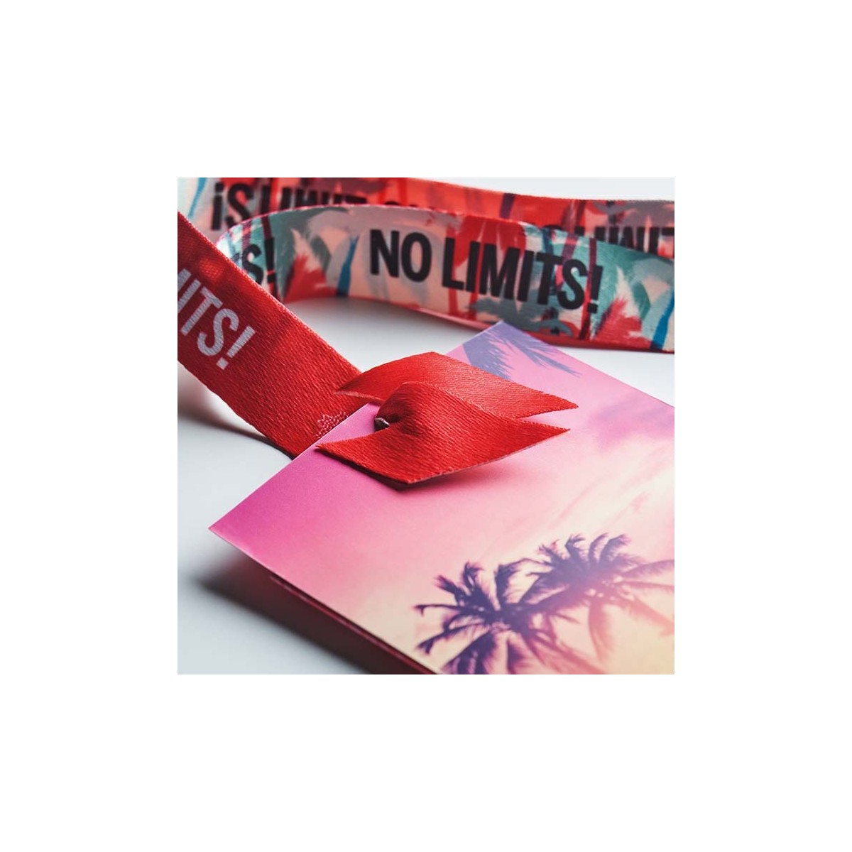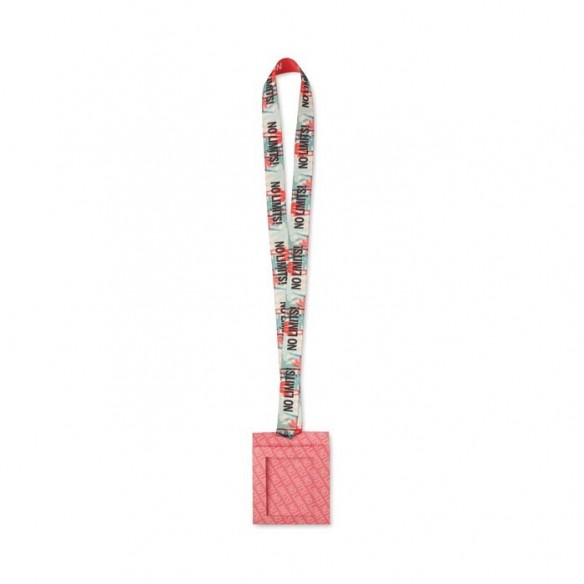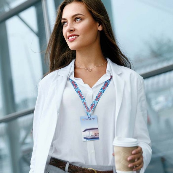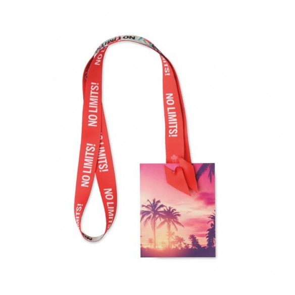 Realizzato in poliestere pregiato, questo lanyard portabadge sublimato è privo dei consueti ganci metallici per trattenere il badge. I tagli all'estremità del nastro trattengono il badge. Brevettato.