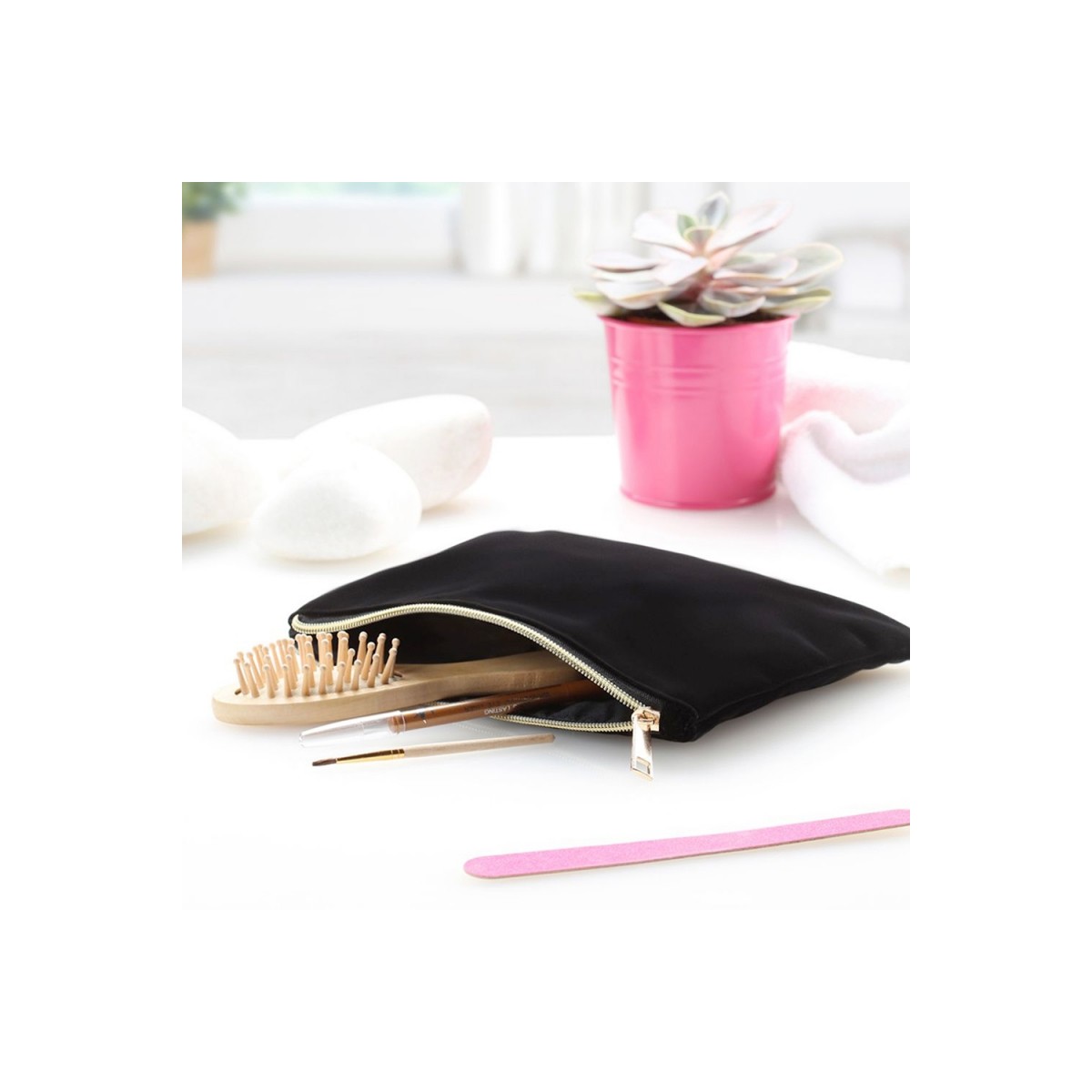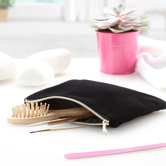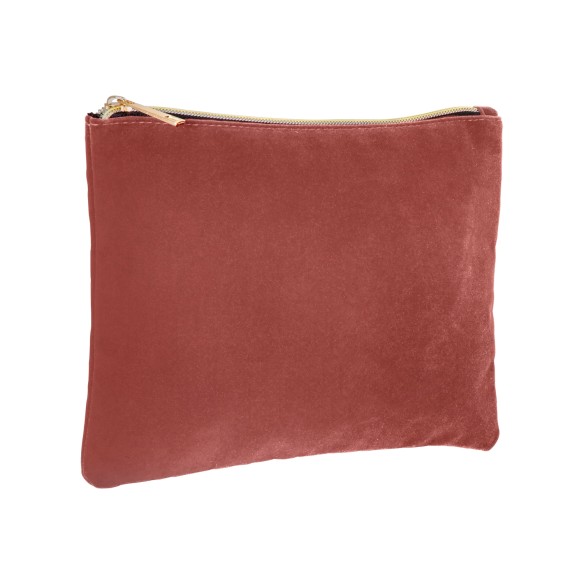 Pochette in velluto, con fodera interna, chiusura con zip e tirazip in color oro.