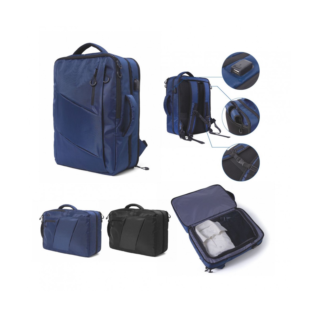 Zaino da cabina in poliestere impermeabile, ampio scomparto principale e tasca esterna imbottita per computer portatile. Doppia maniglia e connettore USB con cavo incluso. Tutti gli scomparti sono dotati di cerniera impermeabile. Tracolla a