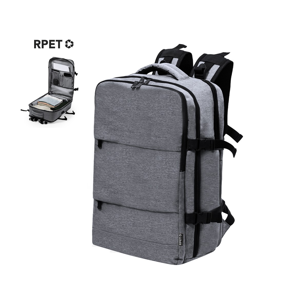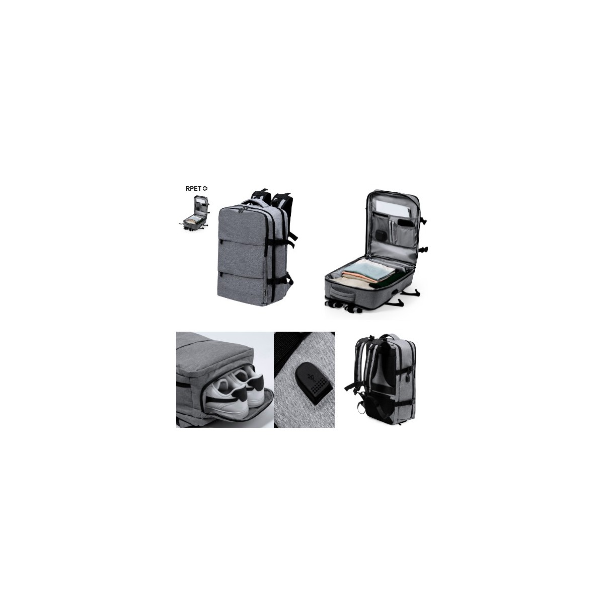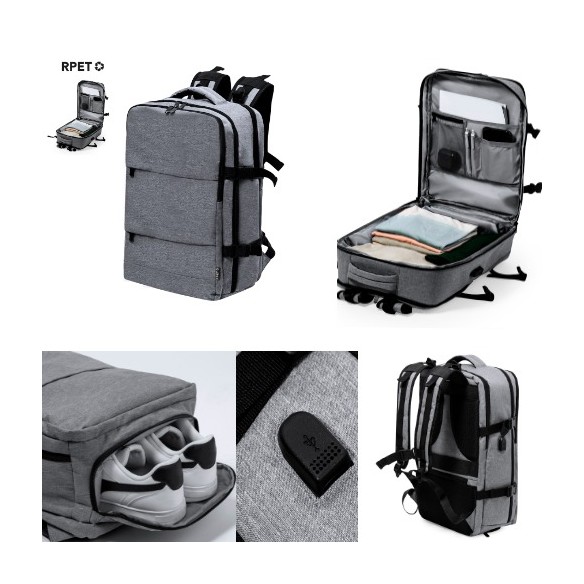 Dispone inoltre di 3 scomparti speciali, una tasca laterale perfetta per un accesso rapido, una tasca per le scarpe sul fondo con occhielli di ventilazione e una tasca antifurto sul retro, oltre a un cavo USB. Perfetto per i viaggi o per l'uso quotidiano, con cinghie regolabili per adattarsi a tutti gli stili di vita. Disponibile in nero e grigio, con logo RPET incluso. Confezionata singolarmente in un sacchetto riciclato.