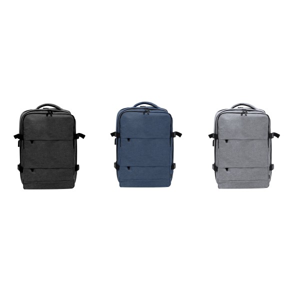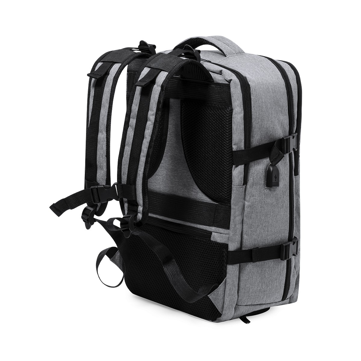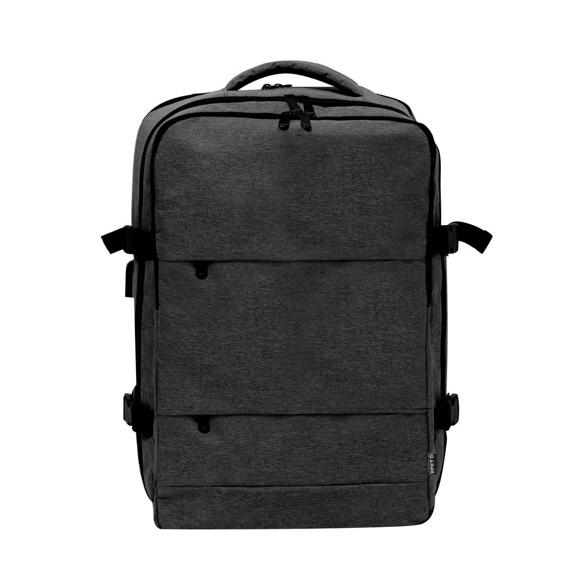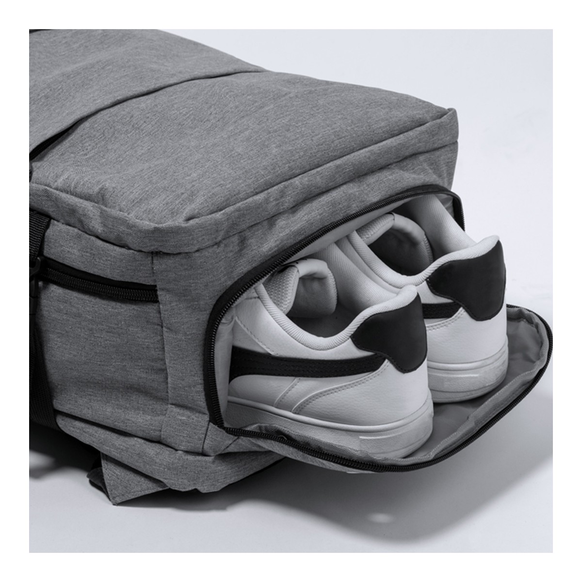 Dispone inoltre di 3 scomparti speciali, una tasca laterale perfetta per un accesso rapido, una tasca per le scarpe sul fondo con occhielli di ventilazione e una tasca antifurto sul retro, oltre a un cavo USB. Perfetto per i viaggi o per l'uso quotidiano, con cinghie regolabili per adattarsi a tutti gli stili di vita. Disponibile in nero e grigio, con logo RPET incluso. Confezionata singolarmente in un sacchetto riciclato.