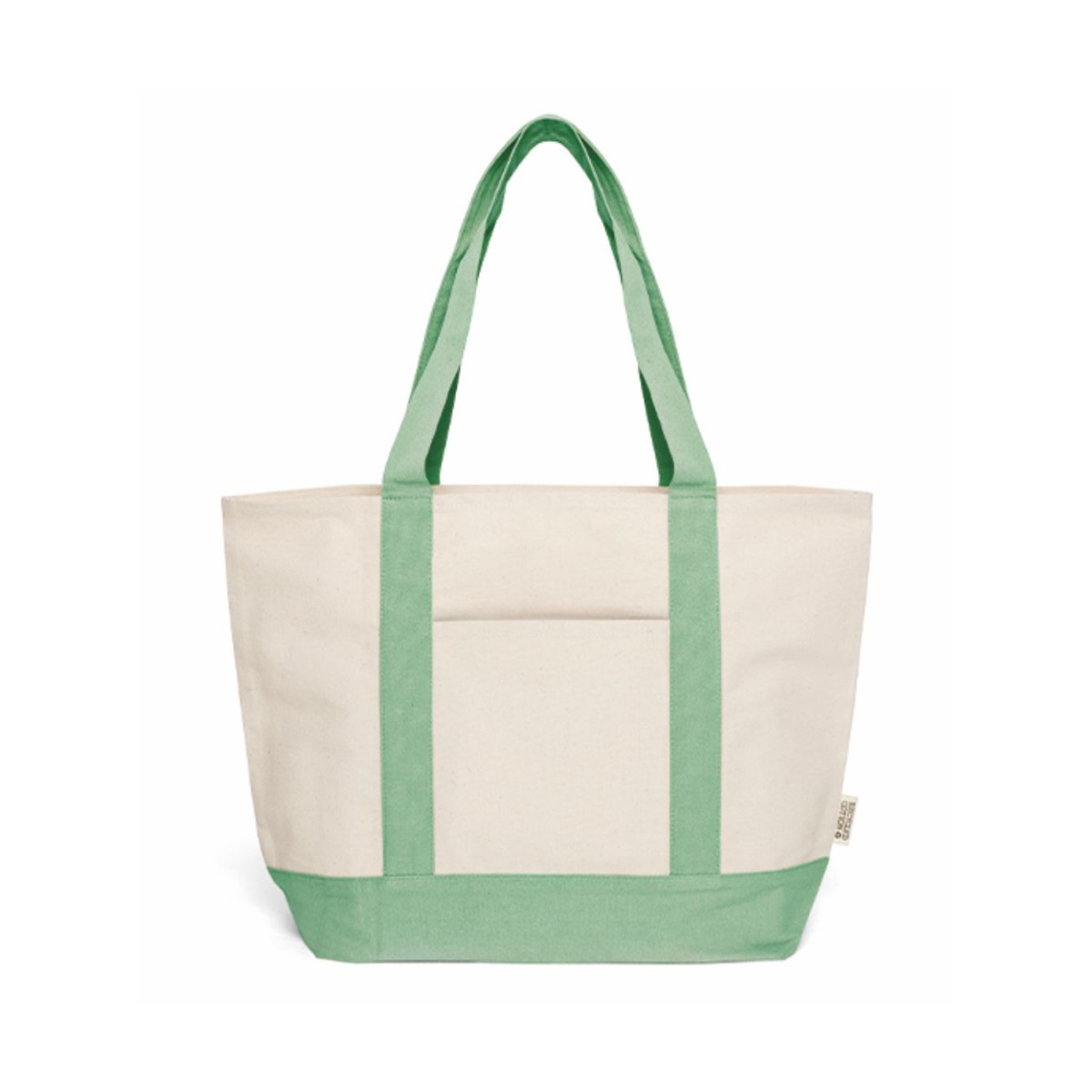 Borsa in cotone riciclato 320g manici da 65 cm. Tasca esterna. Dimensioni: cm 36x52x16