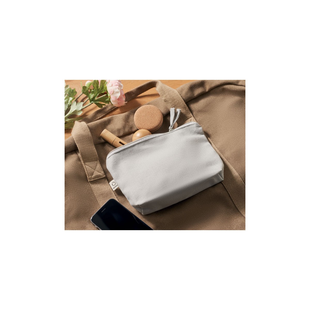 Borsa per cosmetici o accessori in tessuto riciclato (70% cotone riciclato e 30% poliestere RPET) con tiralampo coordinata. 320 gr/m².