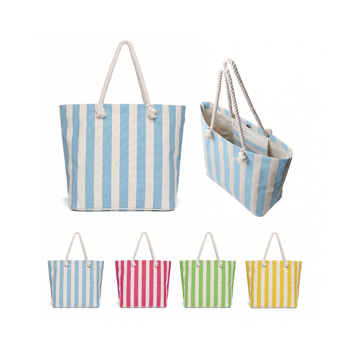 Borsa mare in natural canvas laminato 340g/m², chiusura con clip magnetica, manico in corda ritorto con occhiello cm 70 x ø1,5, tasca interna cm 21x15,5 Dimensioni: cm 38x53x18