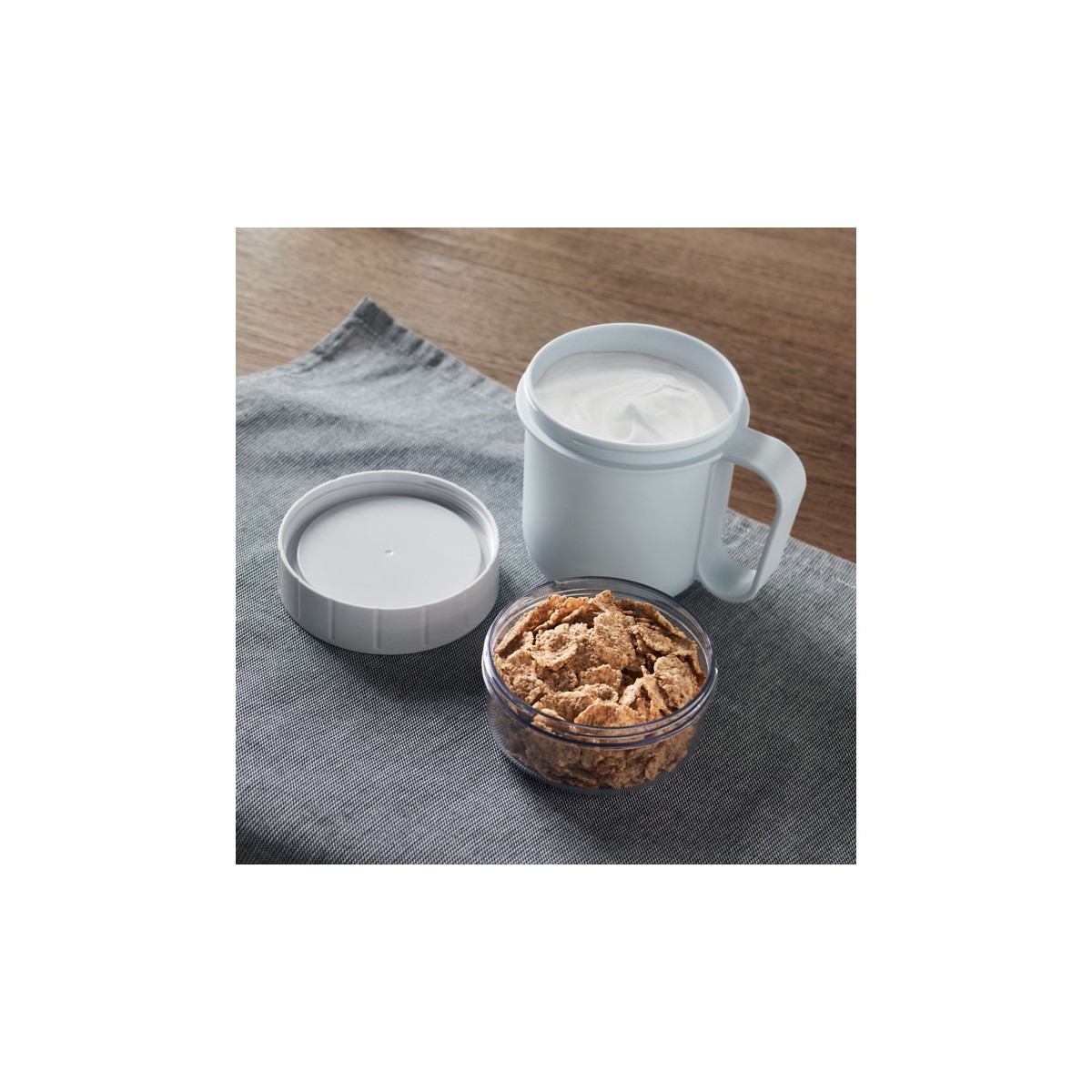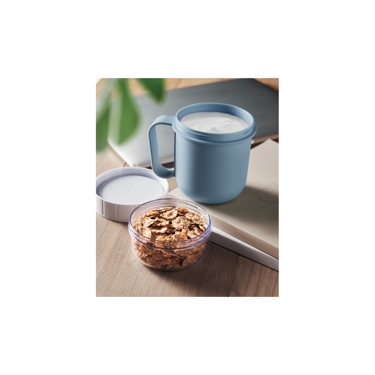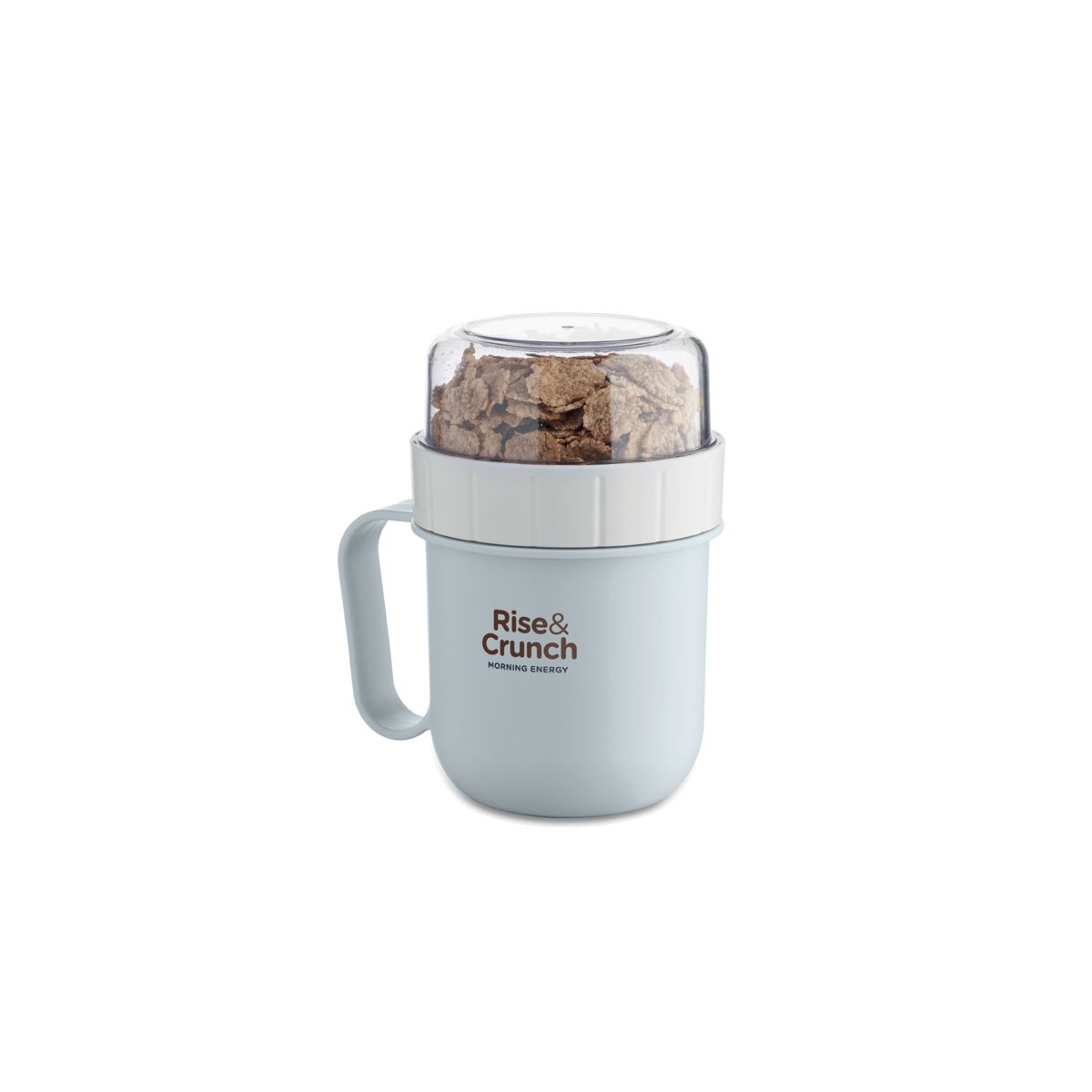 Tazza da colazione o brunch con coperchio in PP e PS. Composto da 2 contenitori individuali per tenere separati gli ingredienti. Capacità: 450 ml e 160 ml. Senza perdite.