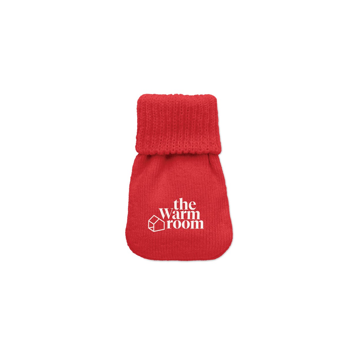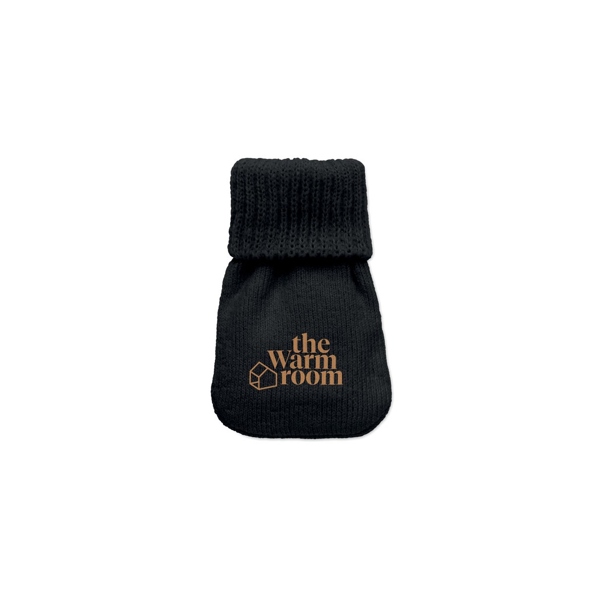 Scaldamani in poliestere lavorato a maglia. Include un cuscinetto termico istantaneo in PVC da attivare premendo la piastra metallica interna. Riutilizzabile mettendo il cuscinetto in acqua calda.