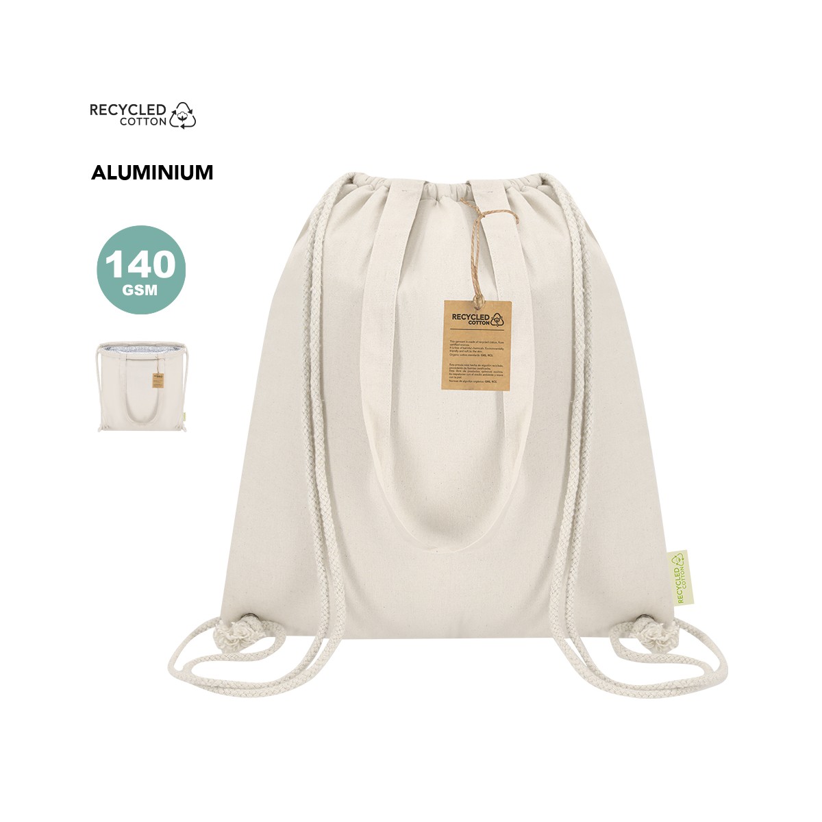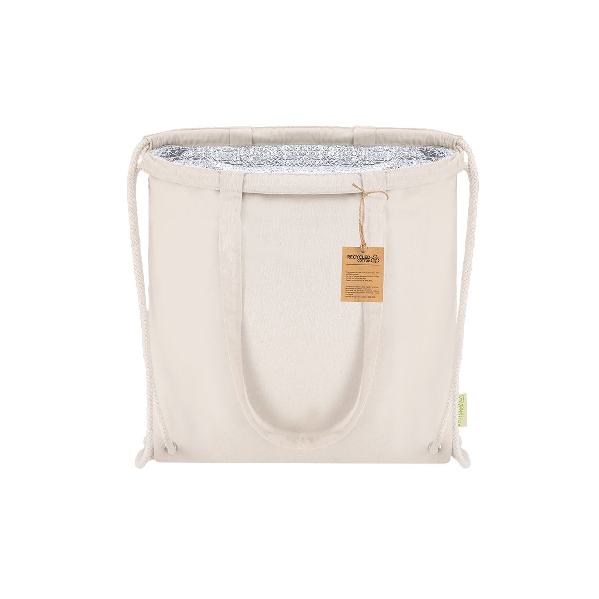 Borsa zaino frigorifero a corda realizzata in cotone riciclato 140g/m2. Con interno in alluminio. Con maniglie abbinate e rinforzate. Resistenza massima di 9kg. Include distintivo di cotone riciclato.