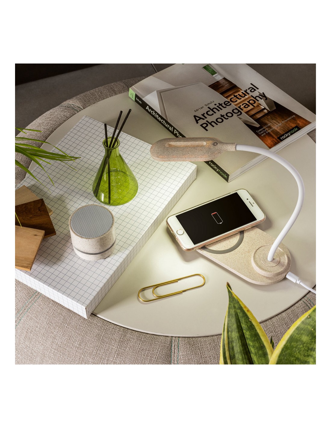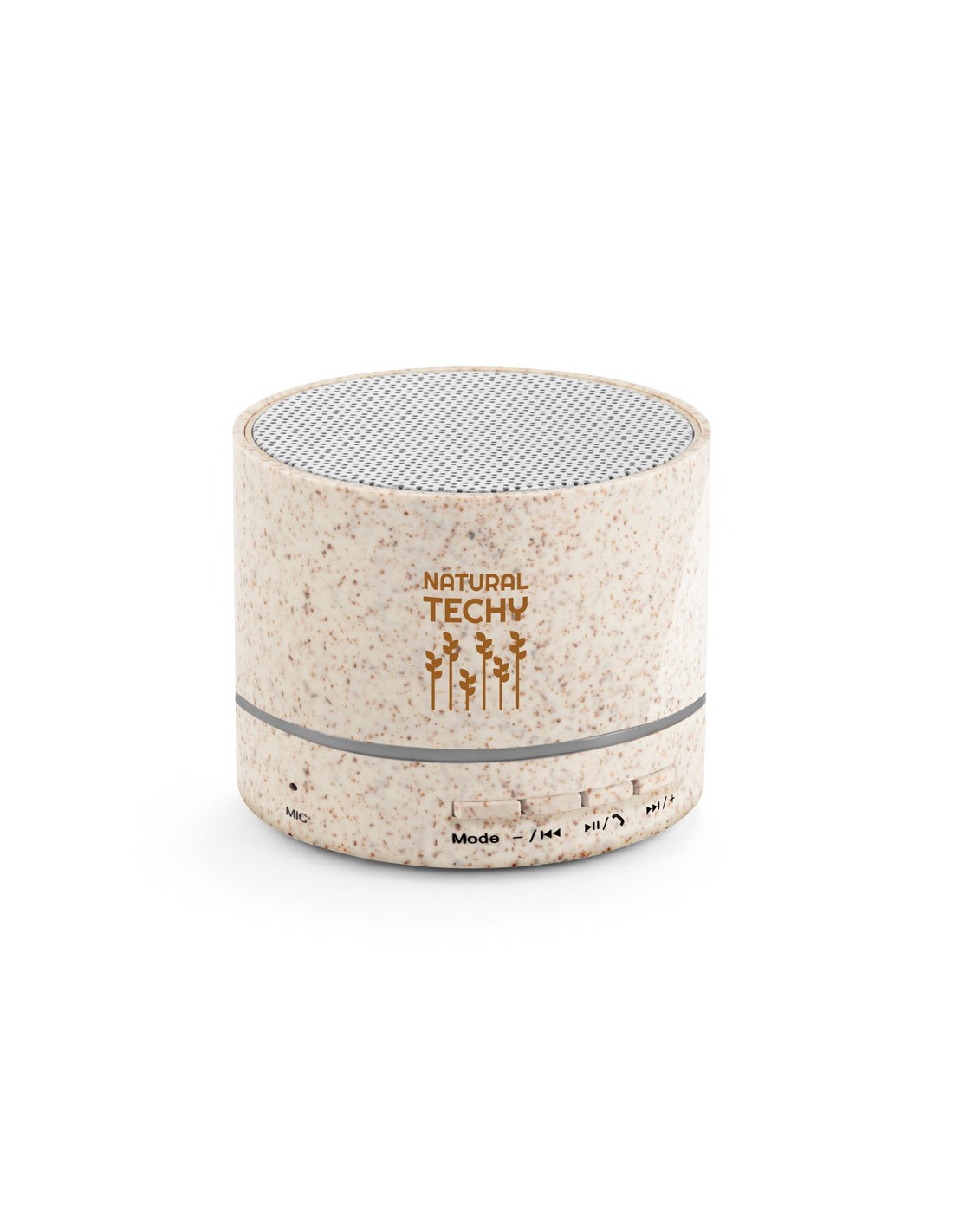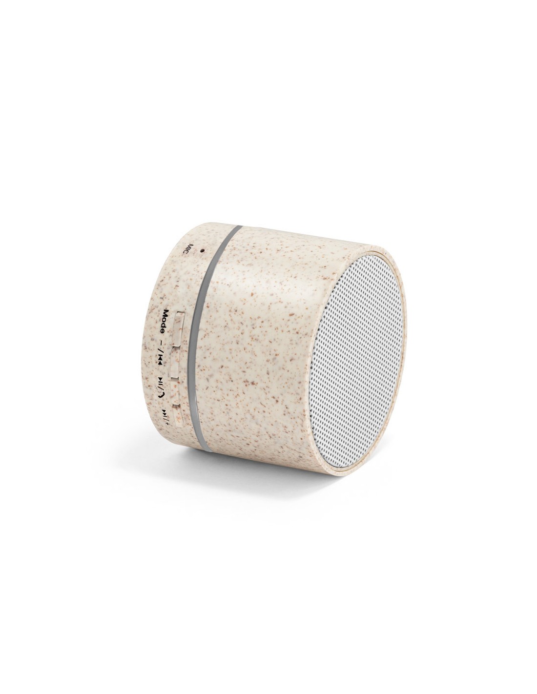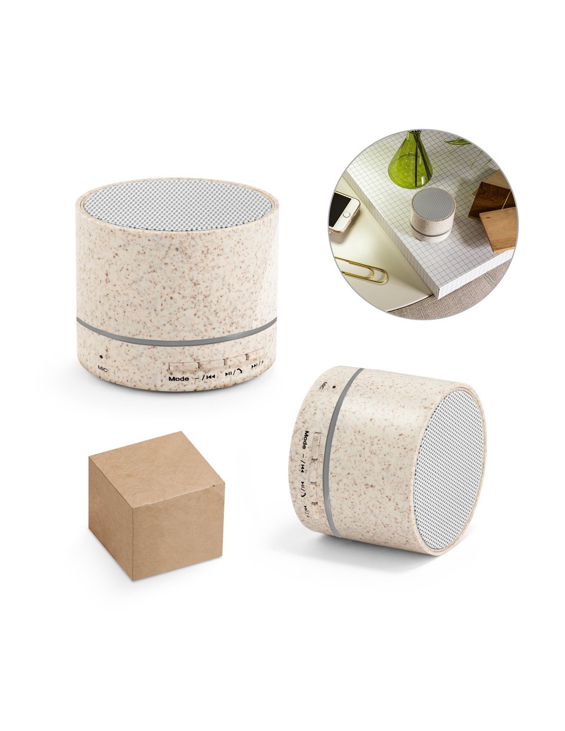 Altoparlante in fibra di paglia e ABS con microfono. Altoparlante con potenza di 3W e trasmissione bluetooth 5.0. Dispone di una batteria di 300 mAh e un'autonomia fino a 2h. Include cavo micro USB. Fornito in confezione regalo di carta kraft. ø62 x 48 mm