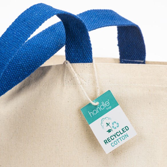 Maxi borsa shopper in cotone riciclato da 280 g/m2 naturale con manici colorati. Dotata di soffietto e manici lunghi per un comodo trasporto a mano e a spalla. È certificata GRS (Global Recycled Standard)