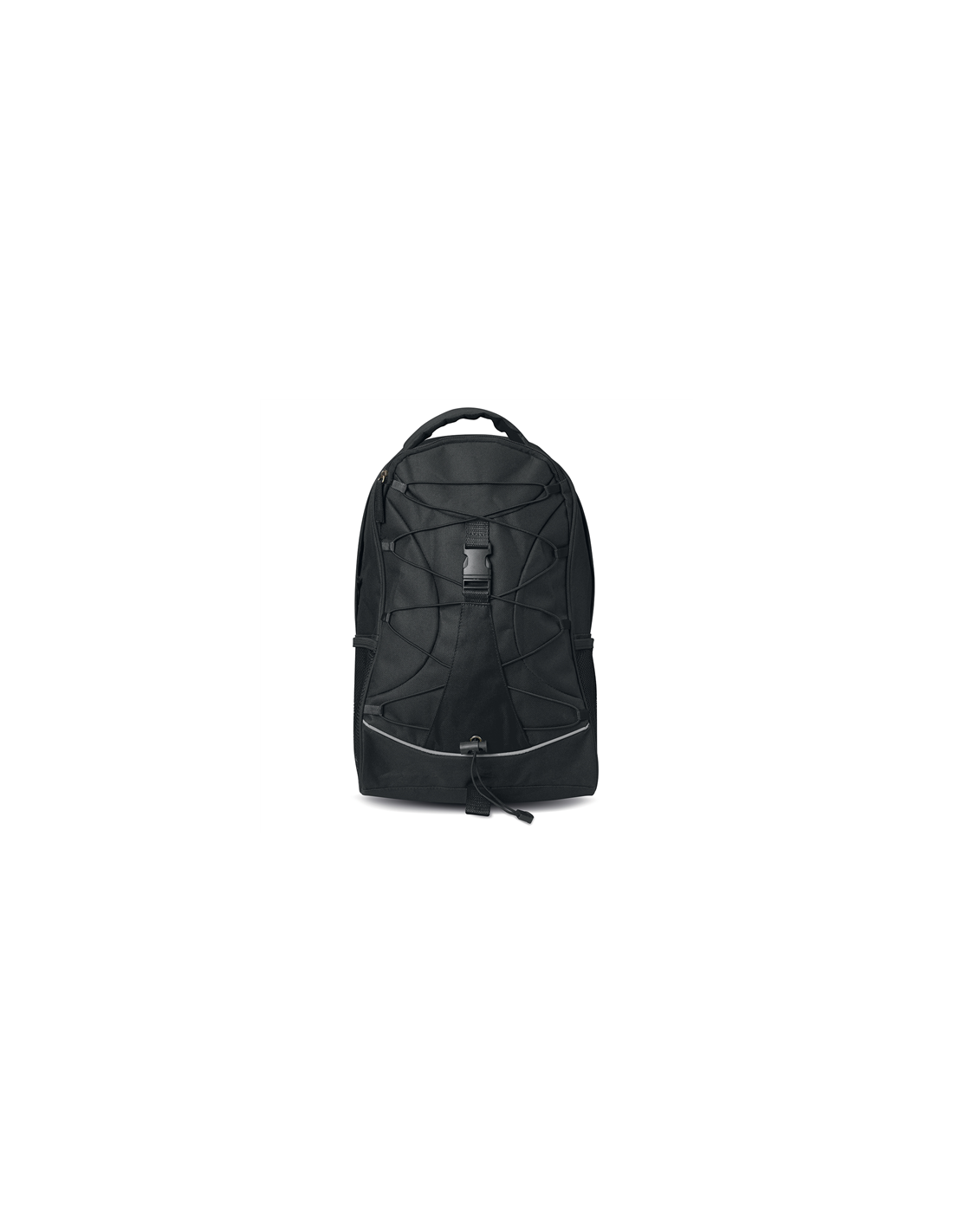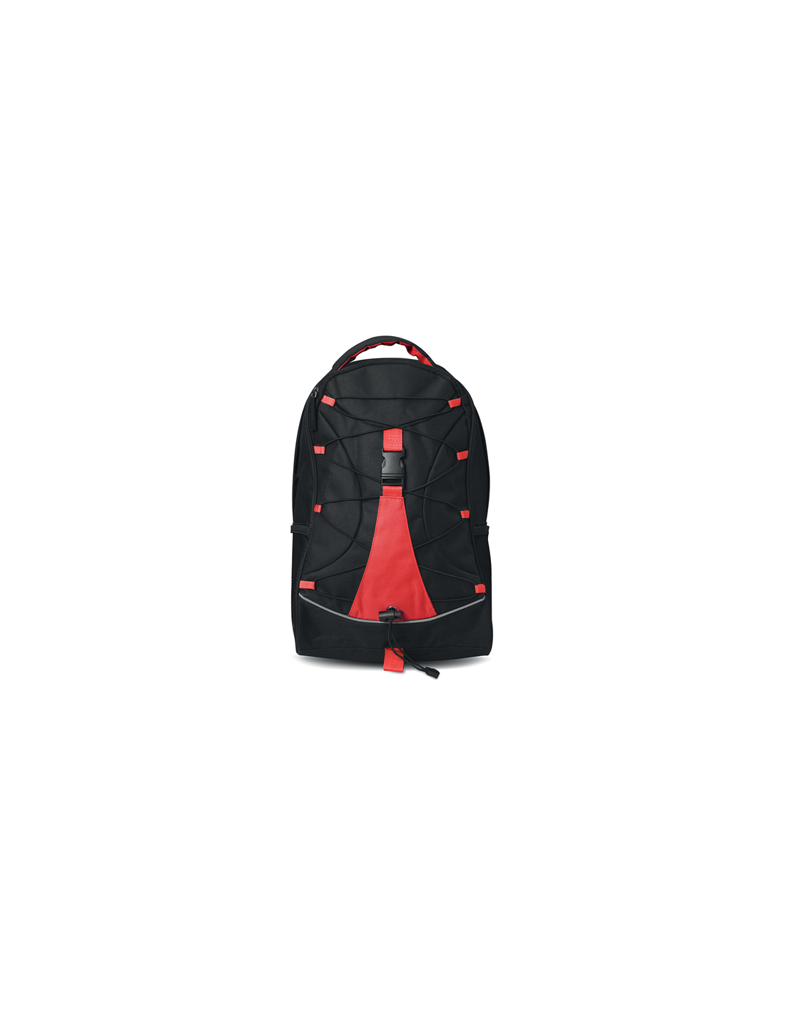 Zaino con parti colorate in 600D poliestere, cordino sulla parte frontale e tasche a rete sui lati.