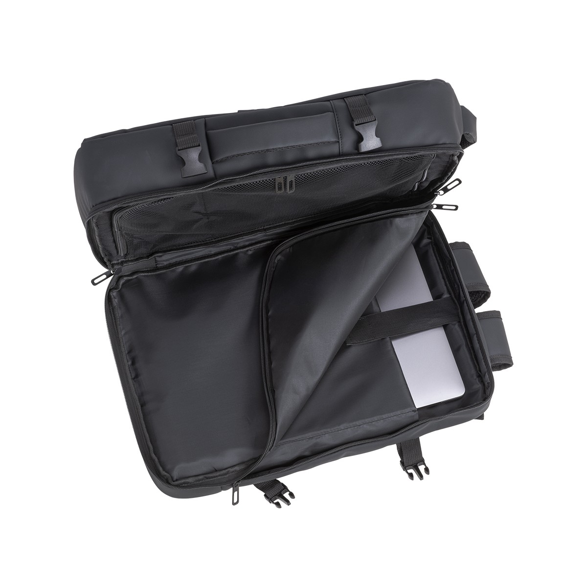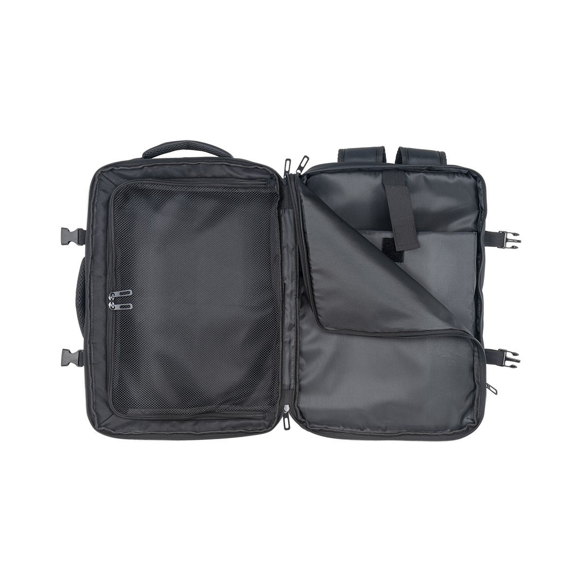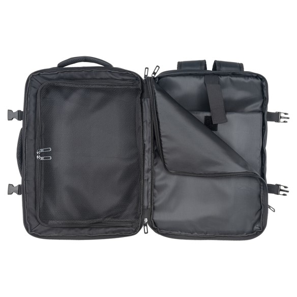 Zaino da viaggio con porta pc (15) in poliestere 600D con rivestimento in PU water resistant. Ampio scomparto principale con tasca retinata. Due tasche frontali verticali con zip e una orizzontale con zip. Schienale e spallacci imbottiti con materiale traspirante. Sistema d aggancio ai trolley